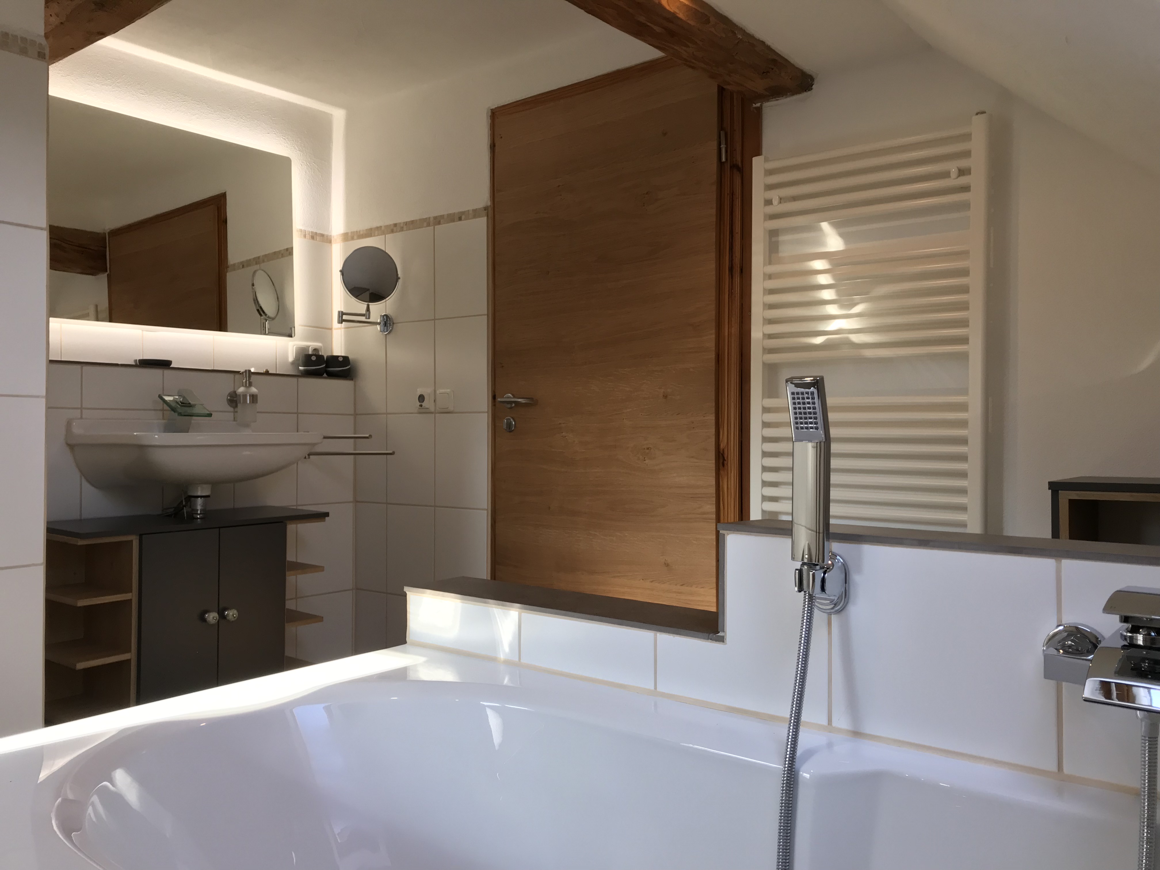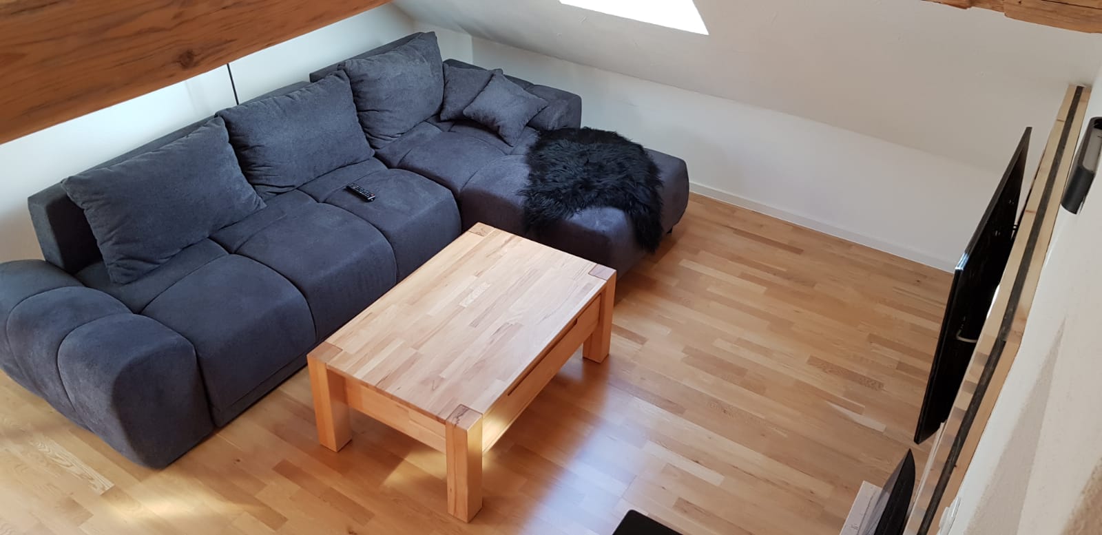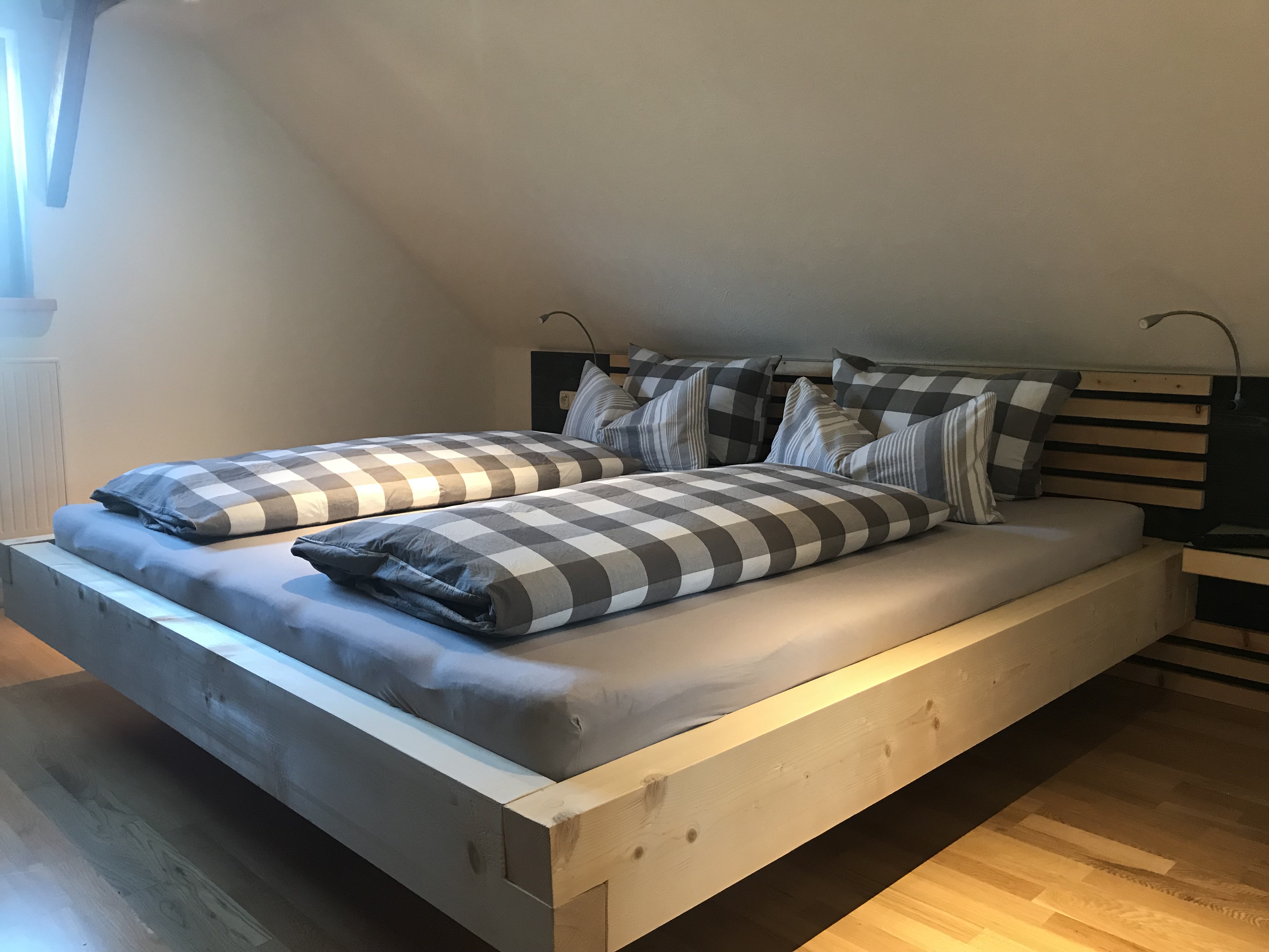 Perfekter Urlaub für die ganze Familie für 2-6 Personen. 1. Dachgeschoss Ferienwohung mit 95 qm - Zum Grundriss Ruhige Lage, Balkon mit gigantischem Bergblick auf den Kofel (unser Hausberg von Oberammergau) Süd-West Balkon mit Sitzgruppe für 4 Personen Komplett eingerichtete Massivholzküche Essbereich, mit großem Tisch, Platz für 6 Personen 1 Schlafzimmer mit einem großen schwebenden Zirbenbett 2x2 m und einem Flat TV und ein großer geräumigen Kleiderschrank 1 weiteres Schlafzimmer mit einem großen schwebenden Zirbenbett 2x2 m Ein weiteres Schlafzimmer in der Galerie 2x1,4 m Kachelofen inkl. Brennholz Ein Badezimmer mit Regen-Dusche/WC und Badewanne Handtücher, Bettwäsche werden gestellt und auf Wunsch gewechselt alles ist aufeinander abgestimmt und modern im Alpenländischen Stil eingerichtet Einen kostenfreien Stellplatz direkt vor der Ferienwohnung Neu: GästeApp mein Quartier mit allen Informationen für einen perfekten Urlaub in Oberammergau keine Endreinigungskosten, keine Kaution, Neu: kontaktloser Self check in und Check out möglich4-6 Personen auf Wunsch möglich Für unsere Geschäftsreisenden, die NATO Schule ist bequem in 10 Minuten zu Fuß erreichbar, der Bus von der NATO Schule haltet direkt vor dem Haus Jetzt Buchen